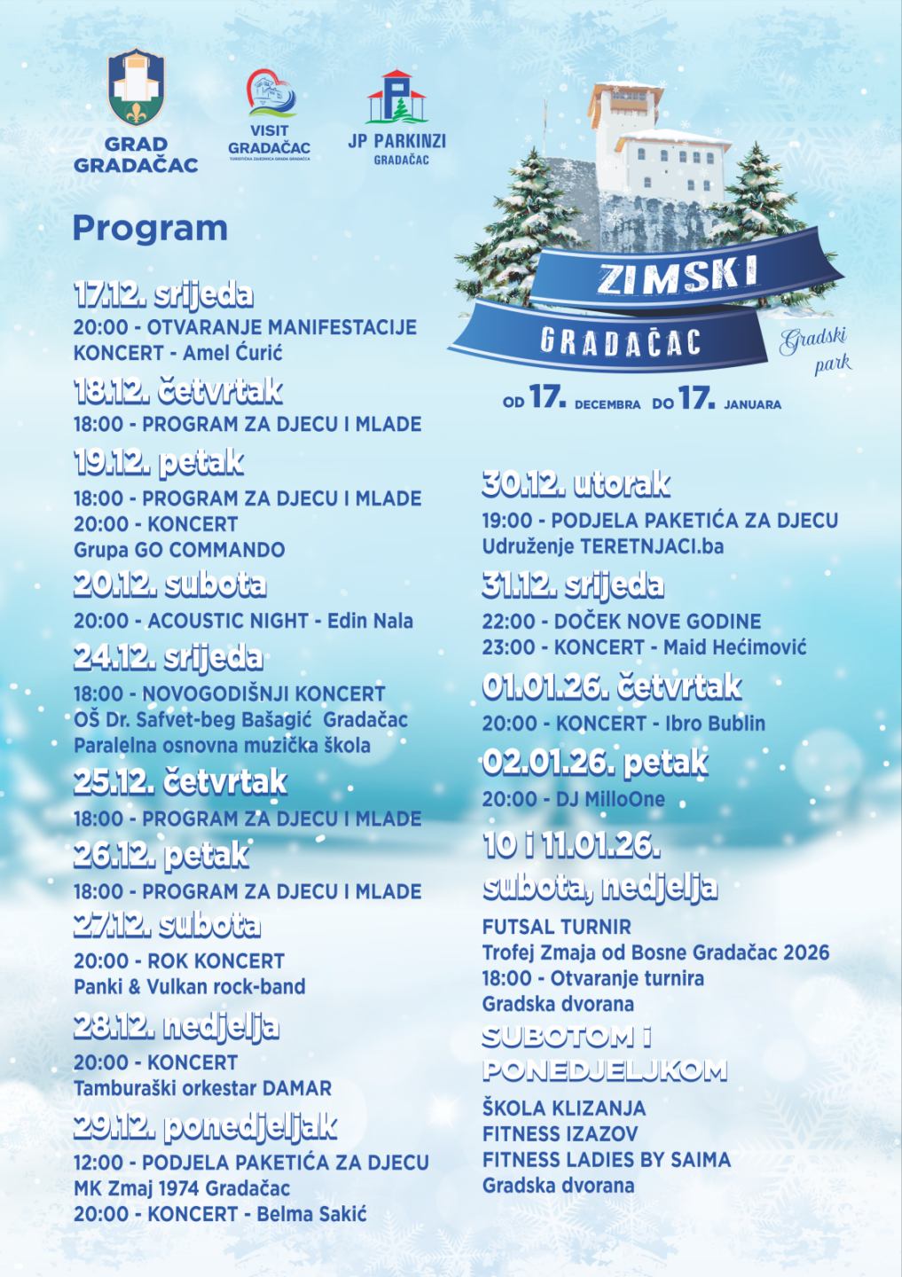Koncertom Amela Ćurića u srijedu 17. decembra bit će otvorena manifestacija “Zimski GRADačac” koja će trajati od 17. januara 2026. godine. Manifestacija „Zimski GRADačac“ će ponuditi niz kulturnih, koncertnih i društvenih sadržaja sa velikim brojem učesnika i programa namijenjenih najmlađima ali starijima.